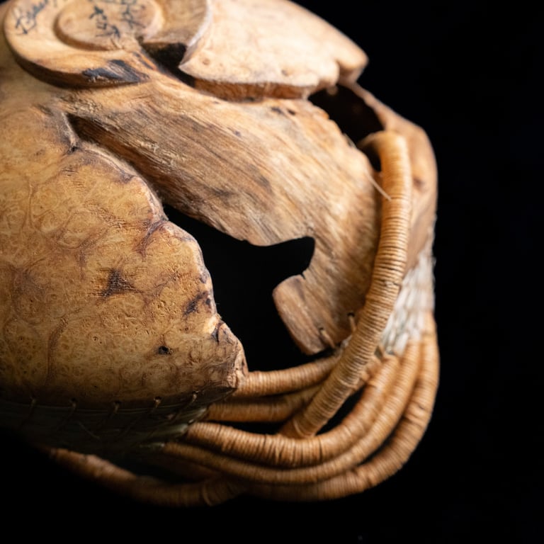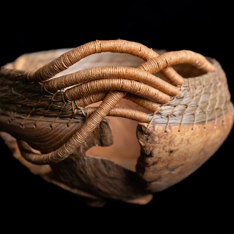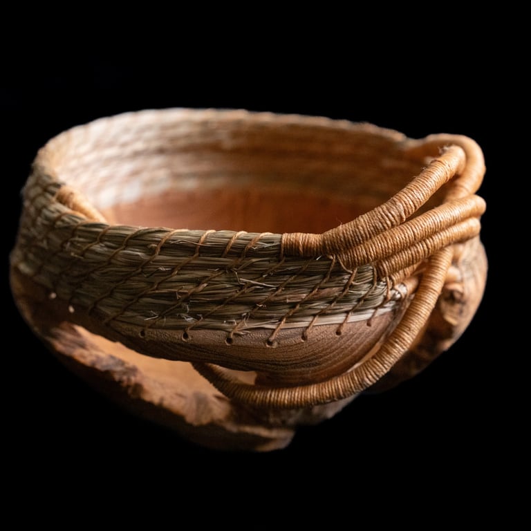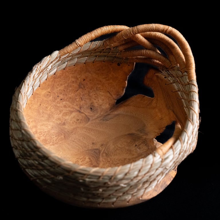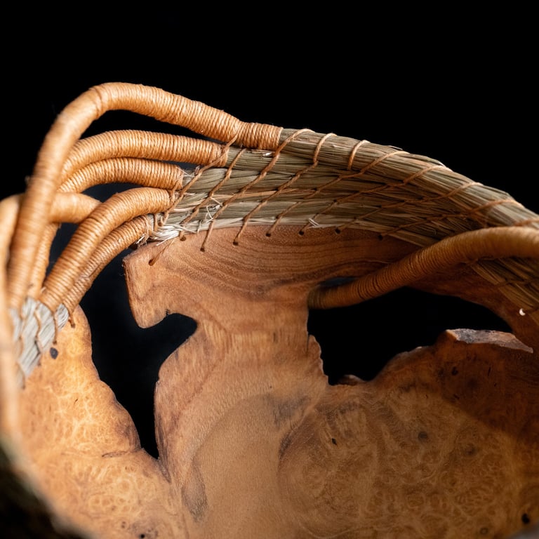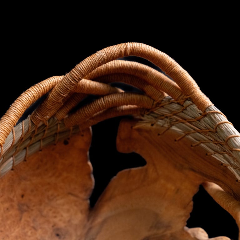 burled wood, sweetgrass, waxed linen