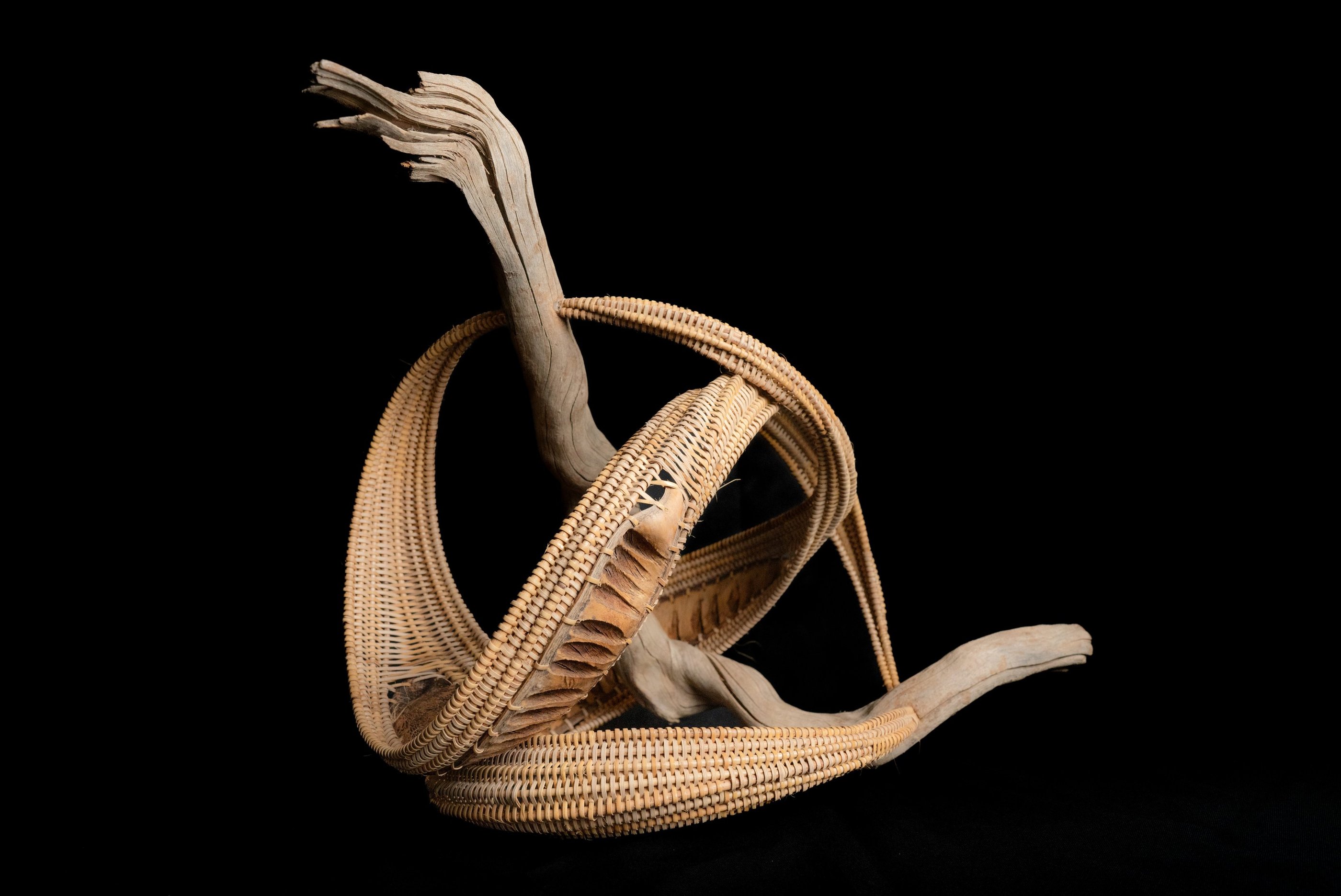 Since then, I have developed techniques to achieve shapes and forms that I wouldn’t have believed were possible, melding tradition and art with materials from nature (sticks, driftwood, seedpods, and various natural dyestuffs for color). Each piece is evocative of the natural world, be they amoebas, sea anemones, pods, vines, or maybe things that don’t have names yet!